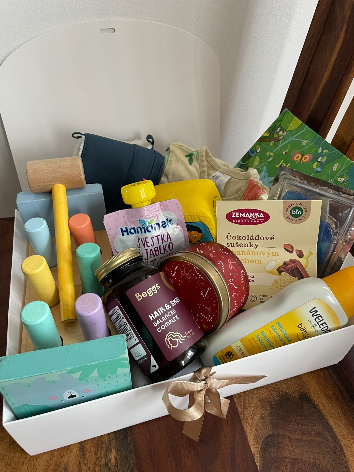 Součástí je naše mateřské know-how: co v praxi skutečně funguje a co ne. Neztrácejte čas hledáním na webu ani vlastními chybami, vše podstatné jsme připravily za vás. Každý box je unikátní a jeho přesné složení zůstává překvapením. Chcete vědět, co zhruba můžete čekat?